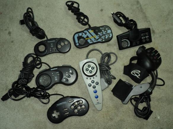 More 3DO controllers plus a few others for good measure. To the left of those are an Avenue Pad 6 and a standard Turbo Duo controller. Below those are the Ultra Racer controller for the PlayStation and the rather awkward Glove controller for the PlayStation that I never quite got comfortable using. I think they tried too hard to bring the whole “tactile” and “virtual reality” think into gaming (once again, before its time) and didn’t do so well with this particular product. Kind of like the Nintendo Power Glove.