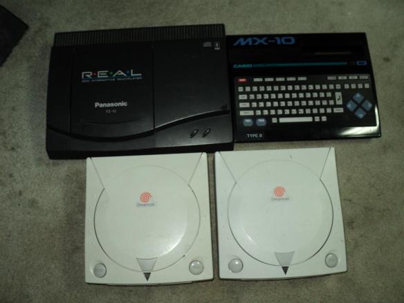 Speaking of 3DO, here’s my Panasonic FZ-10 (I had two FZ-1’s here, but sold them a while ago), plus (not speaking of 3DO) a Casio MSX and two Sega Dreamcasts. Wait, two? TWO?!? I thought I had THREE here when I started stacking stuff on the bed. What the what? Damn gremlins (again!). Seriously! I did see three systems. Eh, maybe it was the dust in the air affecting my vision or something. By the way, you can never have too many Dreamcasts, kids – remember that.