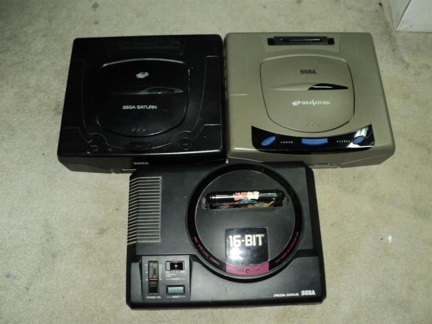 Two Sega Saturns (US and Japanese) plus my Japanese Mega Drive with a copy of Treasure’s spectacular fighting game, Yu Yu Hakusho: Makyo Toitsusen resting comfortably in the cart slot. I wasn’t going to put the MD in the photo, as it’s already been in a pic on the blog, but it was right next to me and plugged in, so… two seconds of unplugging and here you go. I should have at least one more Genesis around here, possibly two and maybe three, but that mystery will need to wait a bit to be solved…