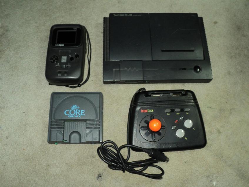 My Turbo Express with a now dead screen (like my Game Gear and slowly dying Atari Lynx, I think solder has come off the circuit board or something, as I get sound but no picture). The US Turbo Duo and Japanese PC-Engine Core Grafx run just fine, though. Amusing trivia: That big ol’ arcade stick on the lower right won’t fit the Duo or Core Grafx at all, but it will fit a TG-16 system. I had one here that I bought new from KayBee Toys when they were run out of business (damn you Bain Capital!), but I sold it off a few years later because I’d gotten that Duo you’re looking at in the photo. Ah well…