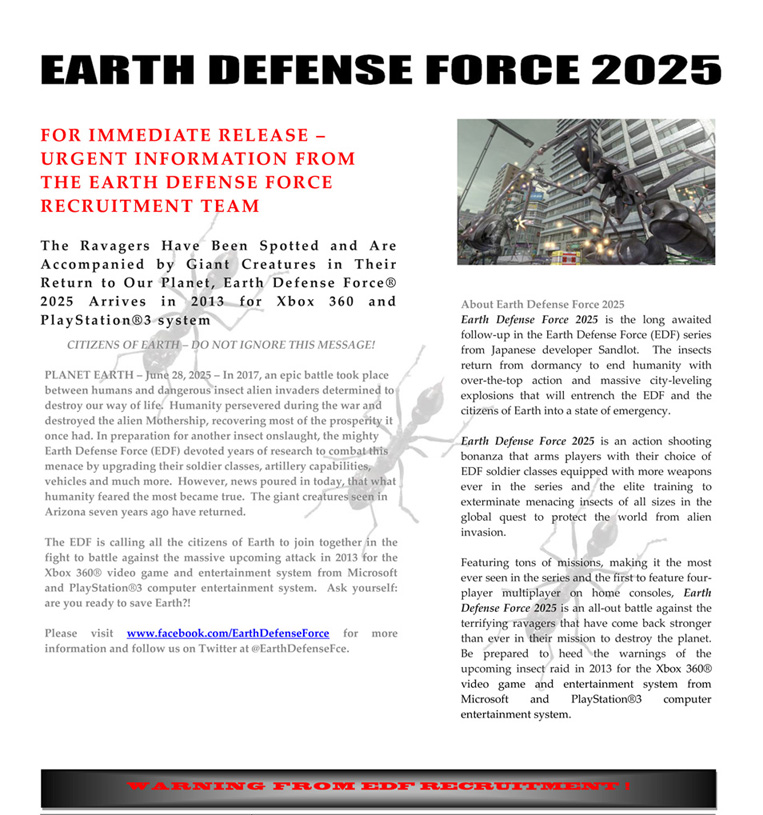 EDF_Wants_You Published December 13, 2012 at 763 × 815 in EDF Recruitment Update! Earth Defense Force 2025 Coming to PS3, Xbox 360 in 2013 Share this:TweetShare on Tumblr Email a link to a friend (Opens in new window) Email Share on Reddit (Opens in new window) Reddit More Print (Opens in new window) Print Pocket Share on Telegram (Opens in new window) Telegram Share on WhatsApp (Opens in new window) WhatsApp Like Loading...