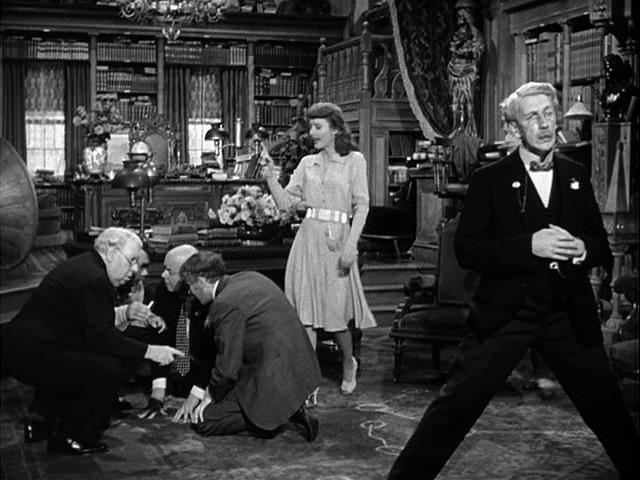 Stanwyck’s Sugarpuss O’Shea is the slang-slinging nightclub talent who moves in with Cooper and the other professors when she decides to go on the lam from a gangster and his muscle who want to hook her in to testify for him in a murder case. The codgers and Cooper reel her in because they just so happen to be working on a dictionary of modern colloquialisms, have hit a few rough patches and need a hot helping hand. Thankfully, the film isn’t taking any of its material at all seriously, so there’s not a hint of lecherousness as the geezers gather, gaze and get used to Sugarpuss’ saucy antics. Cooper plays the anti-O’Shea for a bit and hilariously comes off as much more stodgy initially. But a quick “Yum Yum” lesson or two sets his sails.