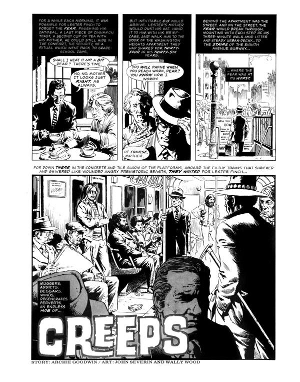 Bruce Jones and one of my main artistic inspirations, Al Williamson team up for an amusing sci-fi tale, “Now You See It” that recalls Al’s glorious work for EC Comics (and Jones’ fascination with trying to recapture that era). It doesn’t fire on all cylinders thanks to a brief and stupidly rapey sequence that ruins the fun tone of the story, but Williamson’s lovely pen and brushwork is quite an eyeful. The other tales are OK and the rest of the volume features a good deal of other great writers and artists (Alex Toth and his striking style are well represented here, as are Esteban Maroto and other Spanish comic artists of the era). And if you’re a Scorcese fan, make sure to check out issue #78 for Archie Goodwin’s “charming” little New York City story, “CREEPS” (art by John Severin and Wally Wood!) for a slice of life about a native who goes a little too wild after he accidentally kills a beggar and gets ideas swirling in his messed up head. Stabby shenanigans ensue with a fitting finale is all I’ll say…