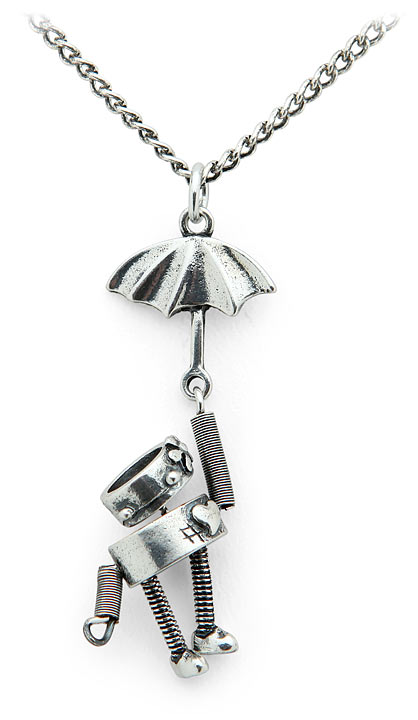 Anyway, this zinc and aluminum piece should please those with nickel allergies, is probably NOT guaranteed to function as an actual umbrella (unless you’re under 1.75 inches tall and can somehow hold this cute thing over your head). and in general, should make whomever gets if quite pleased indeed. Unless of course, you hand it to that robotic cashier machine at the drug store, in which case you should expect: a) an emotionless response and b) to be charged again if the machine recognizes the item as in that store’s inventory. Otherwise, expect c) to be tossed out of that store on your ear for trying to woo a non-sentient hunk of metal, plastic and other materials.