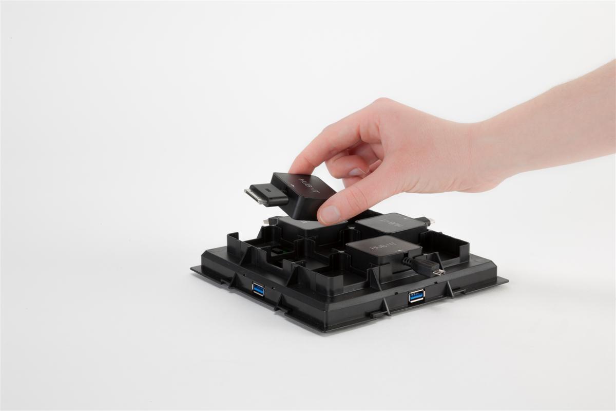 Changing connectors is also fast and easy. The case cover pops off and you pop new connectors into the slots by lining them up and pressing them into place. A delicate touch is required here, as the metal pins on the bottom of each connector can be bent if one is careless. If you have young kids at home who want to charge their devices, I’d highly recommend an adult do the setup and connector changing stuff. Each connector has a short retractable cable that insures you don’t have tangling issues with multiple devices. The caveat here is at 7 1/2 inches, some users may find the concept of “personal space” an issue. Then again, the social element of HUB-IT makes for some fun moments when some stranger slides up when they see a device or a few plugged in and asks if he or she could fit their phone or other tech into your grouping.