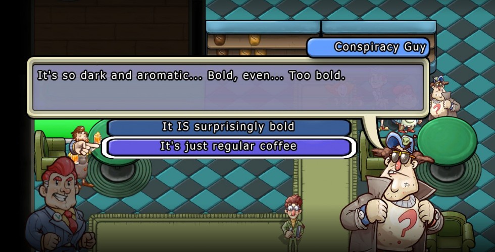 In the game, You’re the Vice President of the World (!) and things are somewhat screwy in the post-election phase. Angry protesters are outside your home, there’s trouble at the local coffee shop and lots more wildness that requires your VP skills. You’ll need to round up and recruit citizens from all walks of life to aid you in your quest, so expect to meet up with a wide cast of odd and amusing party members as the game progresses. This isn’t any sort of emotional powerhouse storyline at all, so going in expecting weep-inducing cut scenes or “powerful” moments is a fool’s errand. On the other hand, if you like pun-heavy puns, goofy-looking enemies and creative uses of coffee, pastry and pharmaceuticals, you’ll love what’s here and then some…