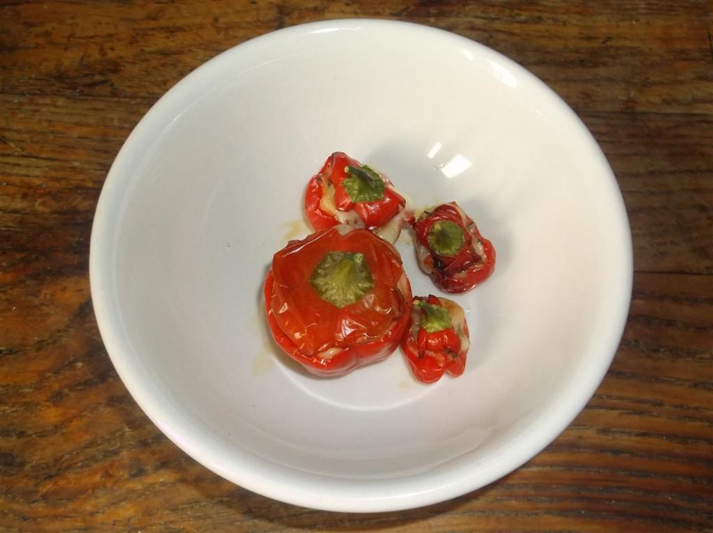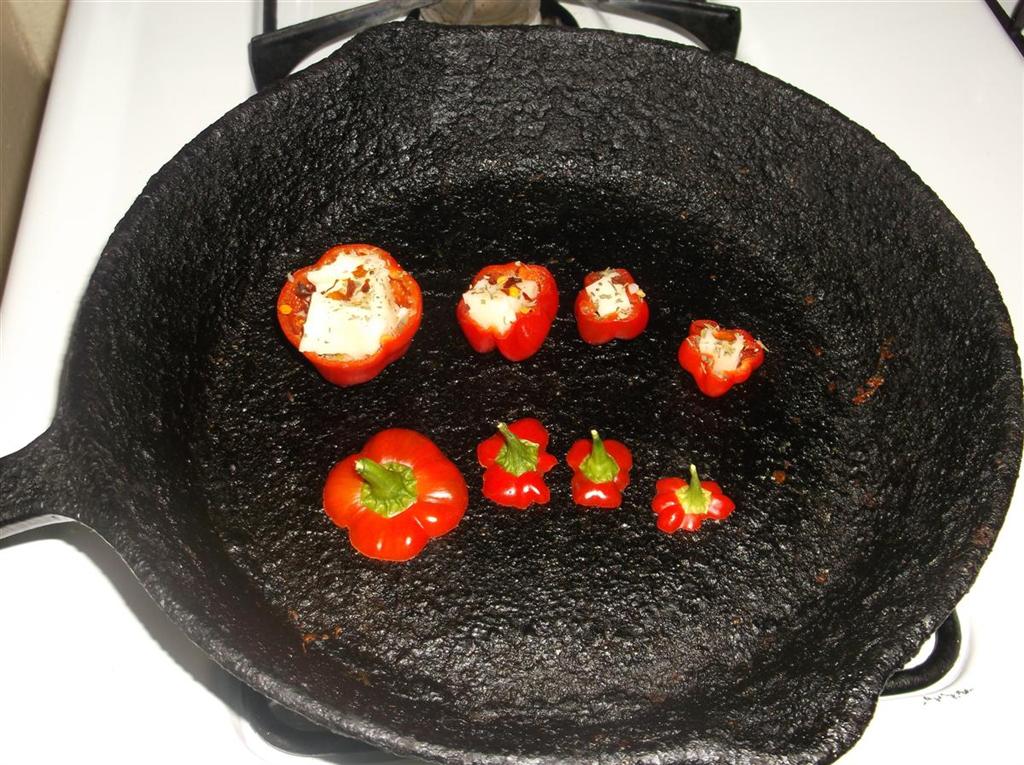 . Those sunny windows here come in handy for growing stuff and I like the size variations from the two plants producing these peppers. As with the last few I kept the simple recipe used: chop off the tops, remove the seeds and save them (More peppers? Sure!), add a filling of choice (crushed garlic and some spinach topped with mozzarella cheese) and bake for about 10 minutes or so in a preheated 350 degree oven.