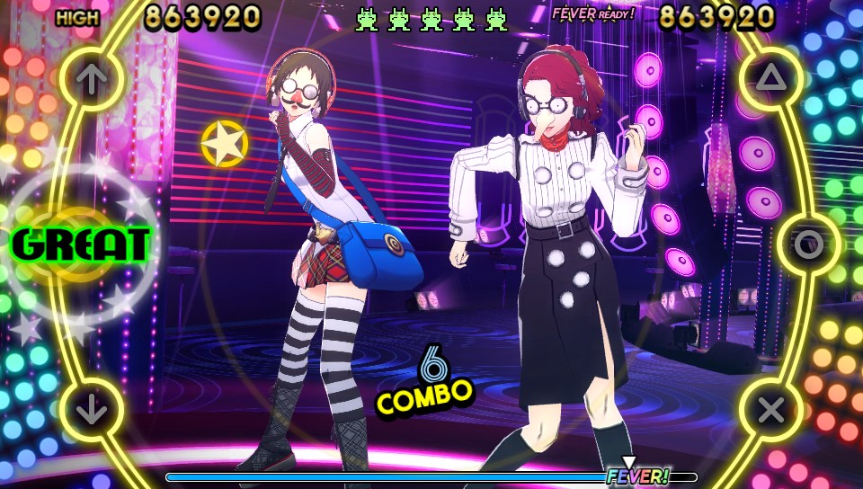 Visually, the character art in cut scenes and the dancing stuff all look spectacular. Even if you go in grumpy, between the colorful art style and even more colorful dancing going on, that sour mug will be filled with sweet candy goodness on a regular basis. If there’s a sore point here, it’s that certain characters important to the Persona series aren’t represented here at all. The Velvet Room’s Igor gets dumped entirely in favor of a costume for one of the characters and a fake nose you can snag from the shop. Boo. It would have also been cool to see a few of the old Persona characters or summons show up as playable dancers. But all you get is Sega’s popular Hatsune Miku and as paid DLC along with a handful of other characters you may or may not want to shell out some extra scratch for.