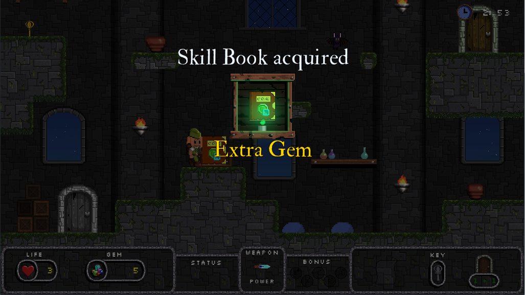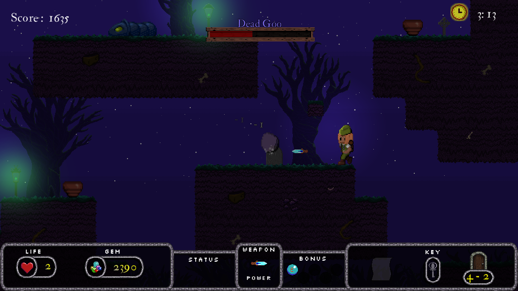 While you can play the game using the keyboard, a compatible gamepad is the best way to fully enjoy the experience. The jumping here is pinpoint and some of the best I’ve ever played. This lessens the annoyance factor considerably because when your little bard buys it, it’s usually via something you didn’t see coming. Many deaths will come from projectiles that zing your way from one side of the screen you didn’t expect, objects that zip your way mid-jump, and all sorts of crafty enemies that will get you by many means on that first run. There’s also a timer in play that actually doesn’t kill you if it runs out. Nope, you just get fireballs slowly raining down from the sky if the clock hits zero, which is bad news if you’re in a hurry to get to that exit door and there are still enemies scooting about. The game says it’s a “2D Retro slow-paced platformer with light RPG elements” and for the most part that’s true. That timer fools you into rushing things until you realize that the game is still playable (but more than a bit tougher) should you pace yourself too slowly.