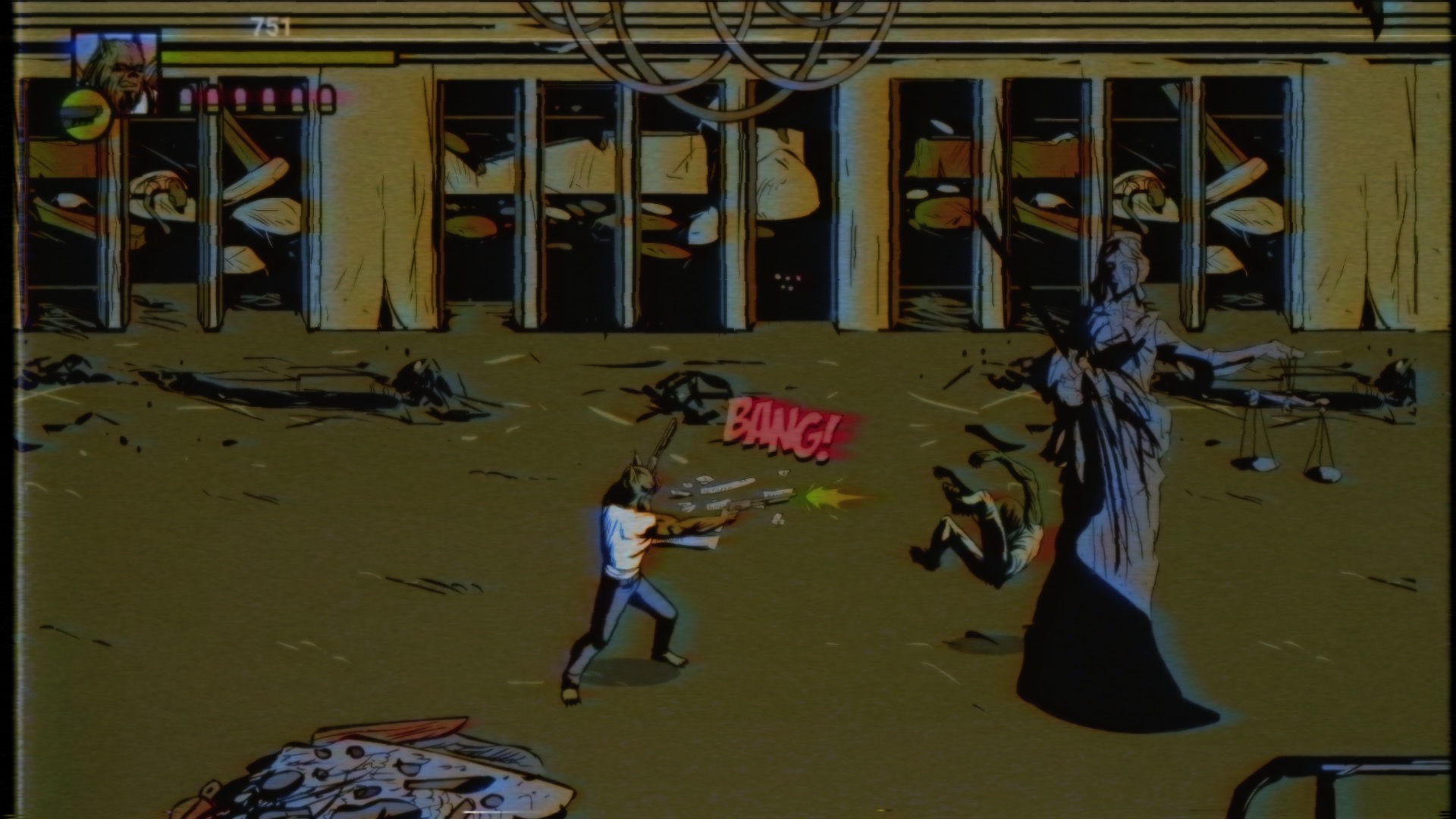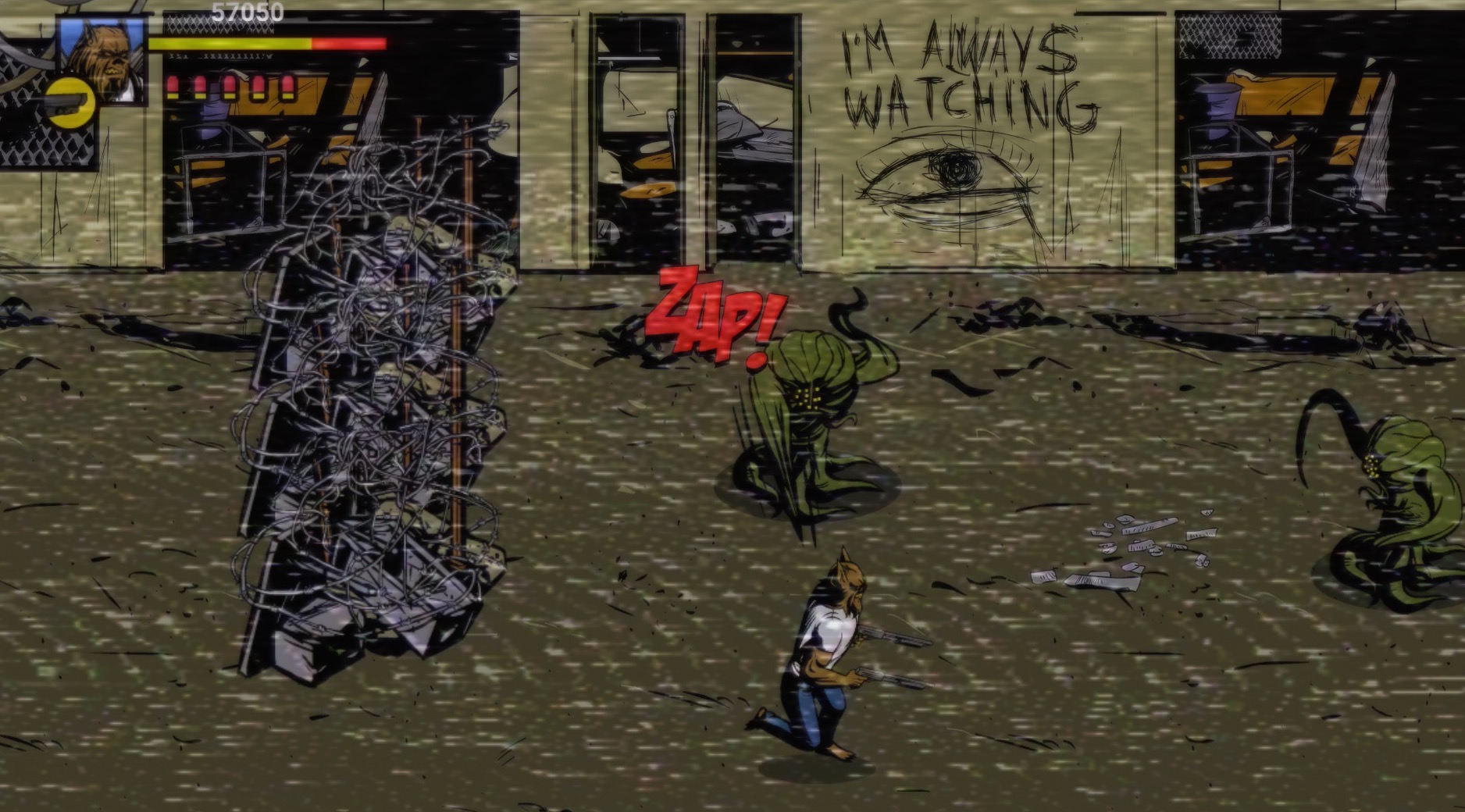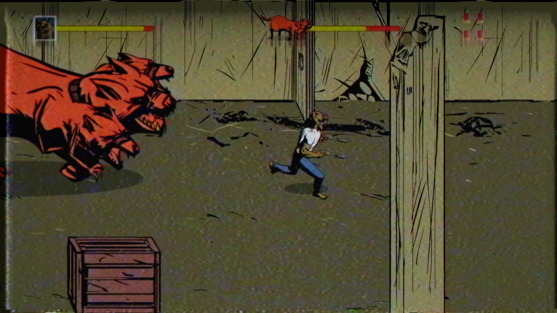 Now, more about those screens (or go watch the video if you haven’t!). In this form they do look kind of like old fuzzy VHS screen captures to the point they’re almost too distracting. But that’s fine with me as long as the game has an OFF option for that graininess. I don’t mind a challenging game at all, folks. But dying because the screen pulled a retro fuzzy interference moment as I was busting a few moves and caps into danger trying to take Lobo out.