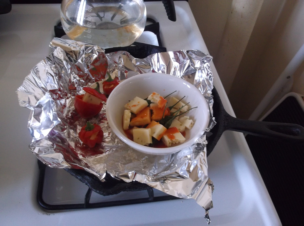 In an oven safe small ceramic bowl (you have one, right?) mix some Extra Hot and Sriracha (optional: some fresh sliced or chopped garlic and perhaps some chopped onion), drop in a few of those chili peppers and cover them with that cheese.