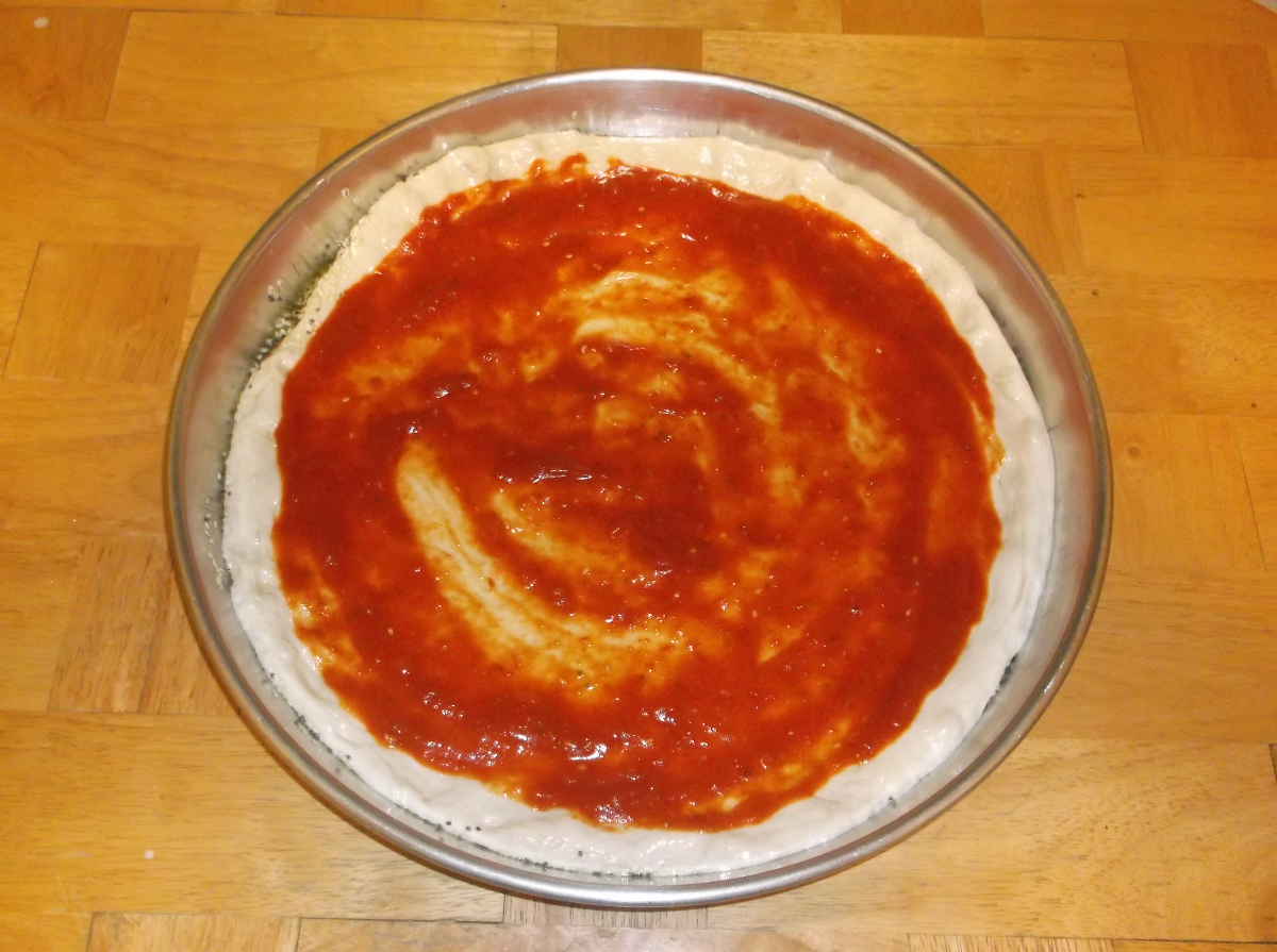 Proofed dough, down in the center and pressed out, rotating the pan so it’s evenly spread out. I need a more traditional flat pizza pan at some point, as I’d prefer to use the rolling pin I bought at some point for more than threatening the neighbor’s kids when they play the hallway and bang on my door. Anyway, mix about a cup or so of sauce with about a tablespoon of Lingham’s (store the rest of that can’s contents in a jar – you’ll be using it again sooner than you think), pour onto the crust and spread in a circular motion with a ladle or other big spoony thing. Don’t use a spoony bard, though. Stuff just gets messy and complicated.