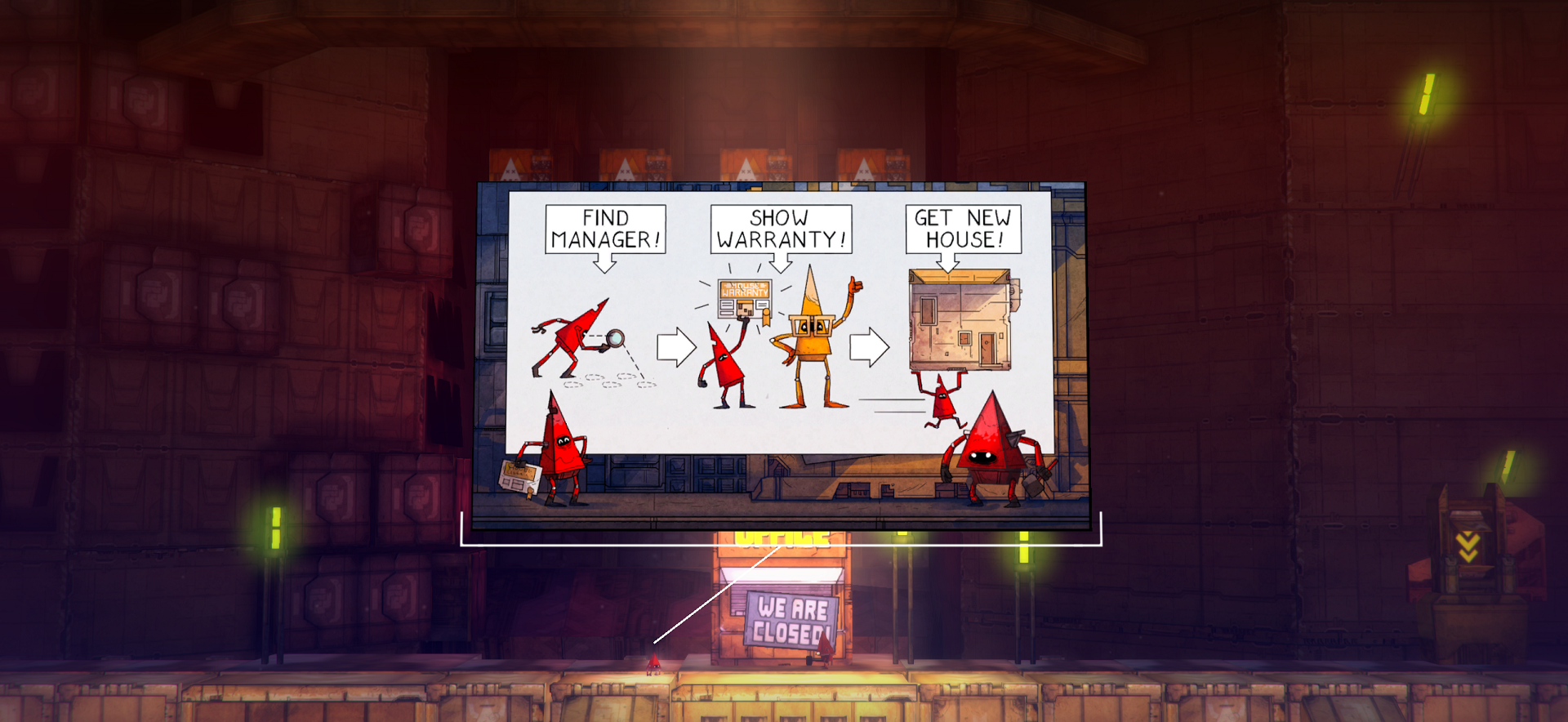 So, Elvis is (no not THAT Elvis!) a humble little metal dude who just so happens to have his home blasted to scrap and as he’s still got the warranty card, he sets out to simply get that card redeemed. If this were the Elvis Elvis, all he’d have to do is snap his fingers and get driven to a new house (or one of many boats). But ORP’s Elvis is just your average pyramid-shaped guy who now needs himself a new place to crash.