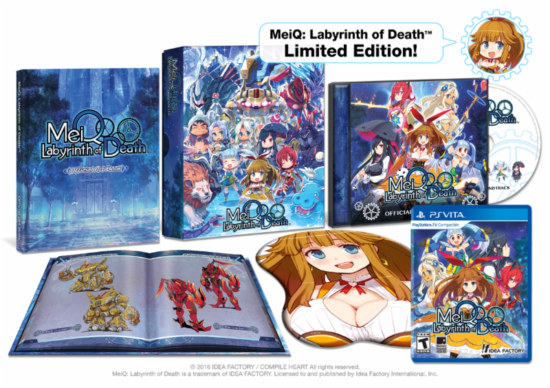 Be careful what you wish for, especially when you wish for something saucy like “anime gals in a DUNGEON… with mecha!, Mwa-ha-ha-haaaaa!” and you’re not very specific beyond that. *POOF* Your wish is Idea Factory International‘s command (*whipcrack!*) with the upcoming Vita game MeiQ: Labyrinth of Death, coming to PlayStation Vita September 13 (North America) and the 16th in Europe.