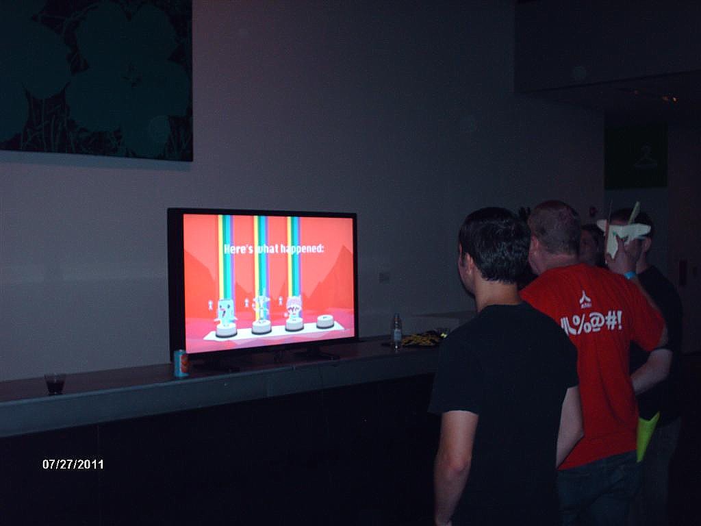Well, that darned “ringer” Pac-Man machine with the funky joystick was ONE problem and bad enough for an old gaming salt like me to come up against, grrrr. But I’ll have to kick myself harder for being SO supremely lame at vib-ribbon when I have it here and used to play it quite a lot. Granted, it HAS been a few years since I picked up that PSOne import, but still… I think someone messed with the controller, as the card next to the exhibit was off a bit. Well, the good thing was everyone who played it had problems as well. I at least managed to make it to the end of the second area on one attempt… and of course, I wasn’t filming or being films when it happened… bleh.
