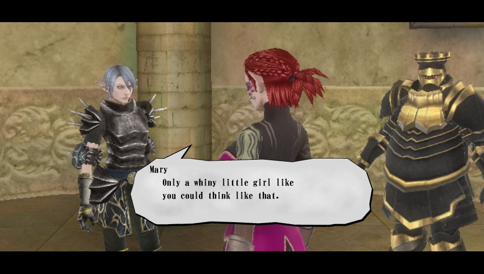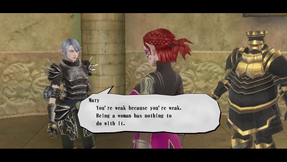 2013-11-10-163038For a game very unfairly labeled “misogynist” and a few other choice negative terms by some skittish reviewers who clearly don’t know the meaning of some of the big words they use, Valhalla Knights 3 sure has a few interesting side-quests and resolutions. Sure, the skimpy outfits and NSFW “Sexytime” mini-game with certain ladies in the game are there to please the more prurient otaku with itchy fingers and the old-school RPG level grinding isn’t for every taste. But dang it if Producer Yoshifumi Hashimoto and his team at K2 didn’t whip in a few oddball surprises that prove they’re not the sexist neanderthals some “journalists” think they are for making this game.